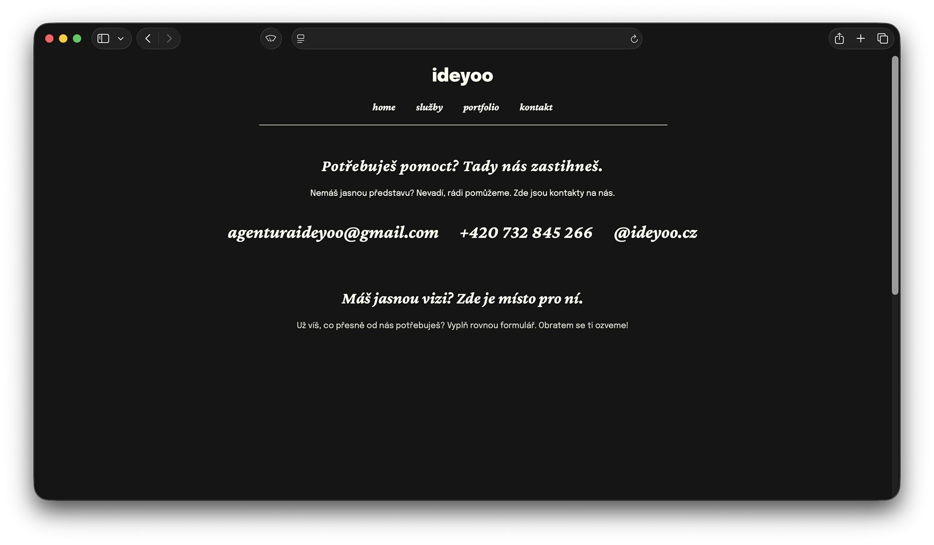 Před vznikem projektu Karels Vision jsem působil pod značkou Ideyoo, která představovala předchozí fázi mé tvorby. Pro Ideyoo jsem vytvořil web v HTML, CSS a JavaScriptu zaměřený na přehlednou prezentaci služeb a moderní minimalistický design. Web sloužil jako platforma pro prezentaci agentury a jejího zaměření na detail, jednoduchost a funkční estetiku.