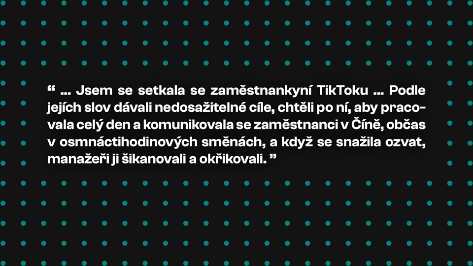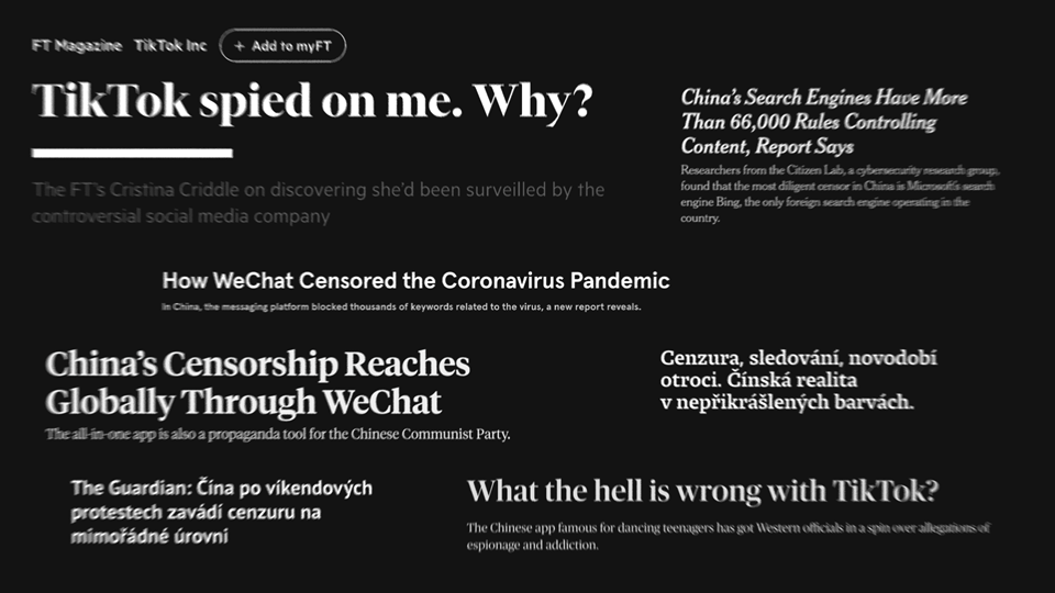 Tento vizuální storytelling byl vytvořen jako grafický přehled tématu čínského kyberprostoru a digitální infrastruktury. Projekt kombinuje reálné mediální titulky, citace a obrazový materiál do jednotné vizuální kompozice. Využívá kontrast červené a černé barvy pro zvýraznění napětí a technologické estetiky, doplněný o minimalistickou typografii inspirovanou novinovým stylem. Jednotlivé vizuály vznikly s cílem představit téma strukturovaně a vizuálně konzistentně v rámci moderního storytellingového formátu.
